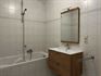 - Ingerichte badkamer met enkele lavabo met kasten, spiegel met verlichting en bad-douche combinatie. Wandtegels tot plafondhoogte.
