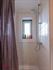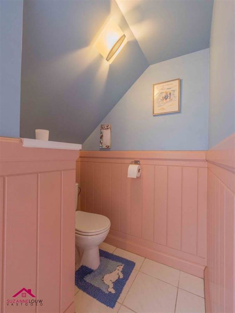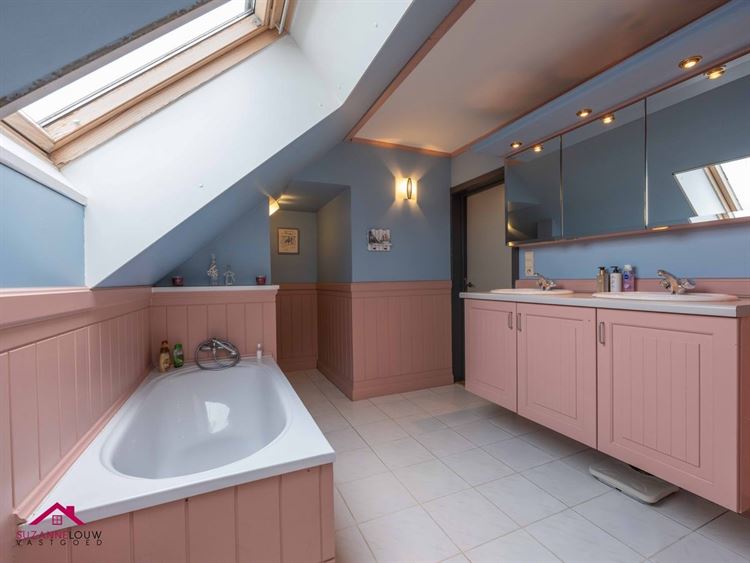 - Landelijk ingerichte badkamer, uitgerust met: badkamermeubel met dubbele lavabo, spiegelkast met verlichting, ligbad, toilet en inloopdouche. De muren werden tot bepaalde hoogte afgewerkt met houten lambrisering. Velux raam. Keramische tegelvloer.