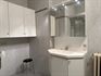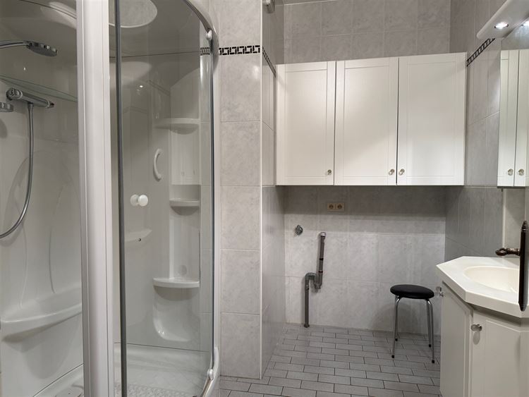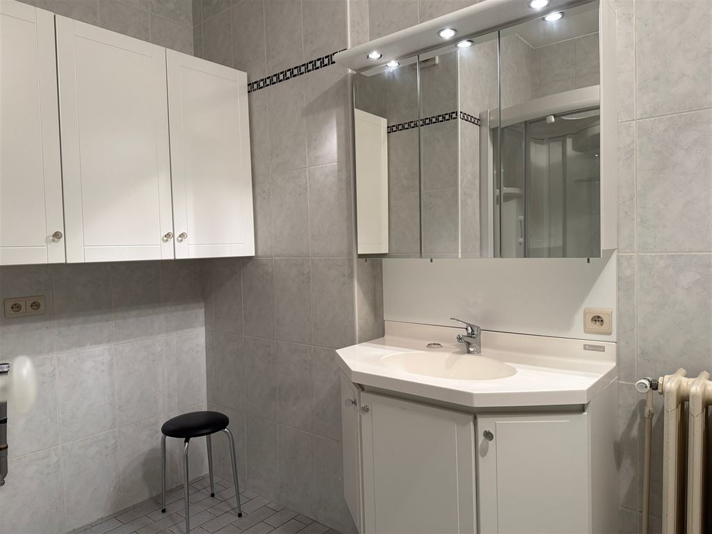 - Badkamer voorzien van een enkel badkamermeubel met spiegel en spiegelverlichting en een douchecabine. Hier werd tevens de aansluiting voor het wasmachine en droogkast voorzien.