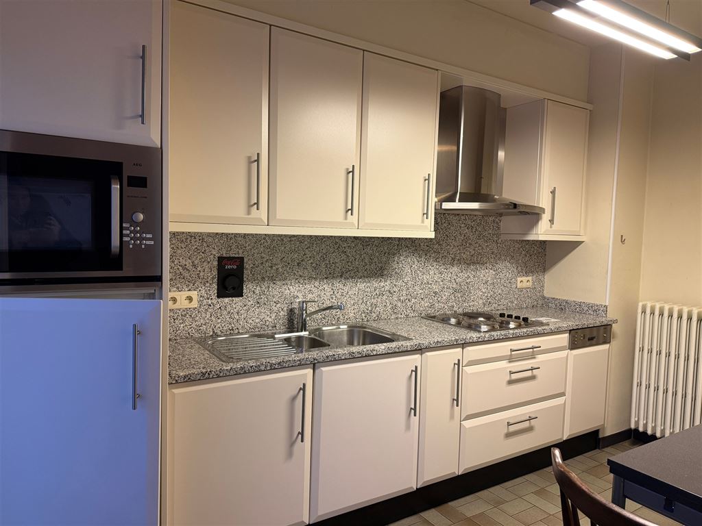 - Ingerichte keuken voorzien van volgende toestellen: elektrische kookplaat, afzuigkap, koelkast, diepvriezer, microgolfoven, vaatwasser en inox gootsteen met afzetvlak. Voldoende opbergruimte.