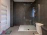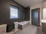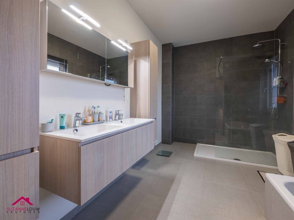 - Ingerichte badkamer voorzien van een badkamermeubel met dubbele lavabo, kolomkasten, spiegelkast met verlichting en inloopdouche. Grijze Keramische tegelvloer.