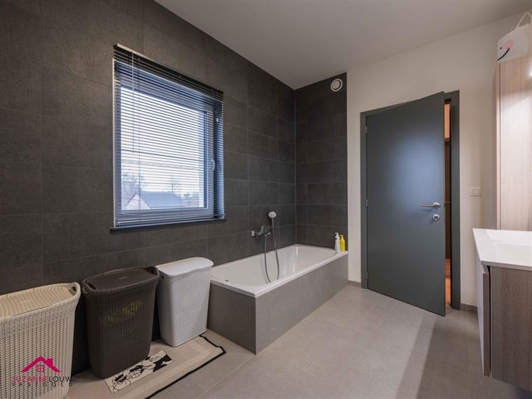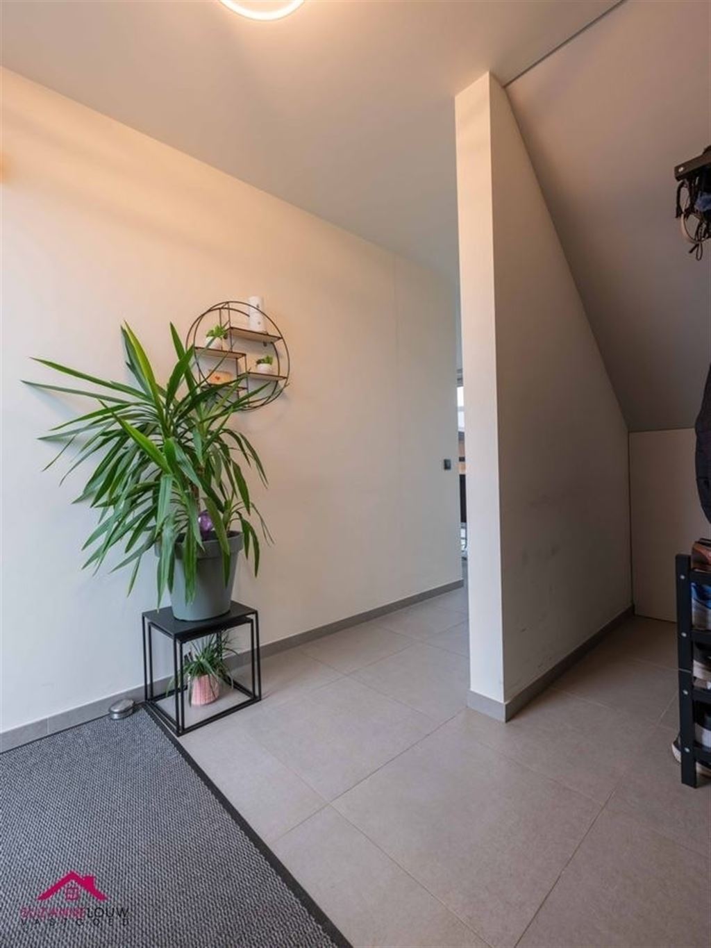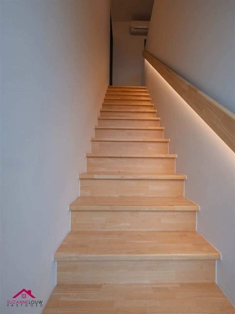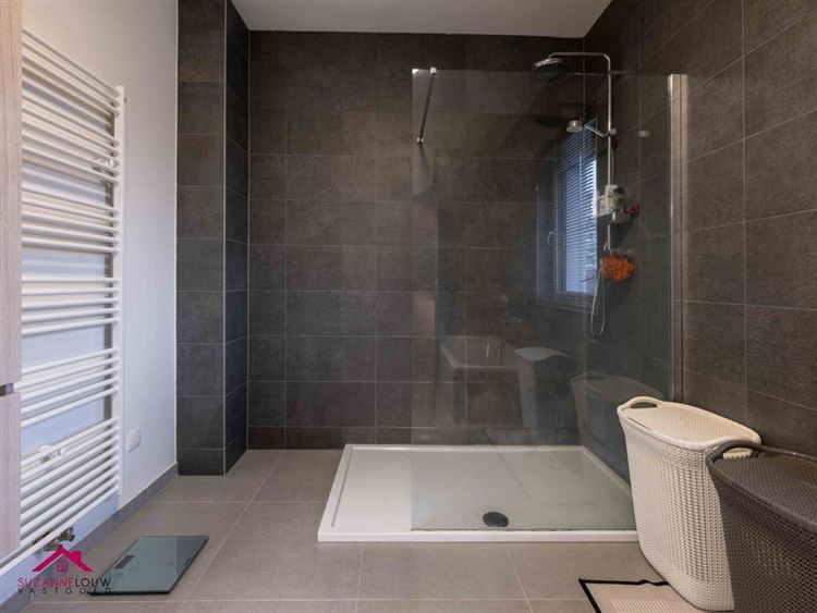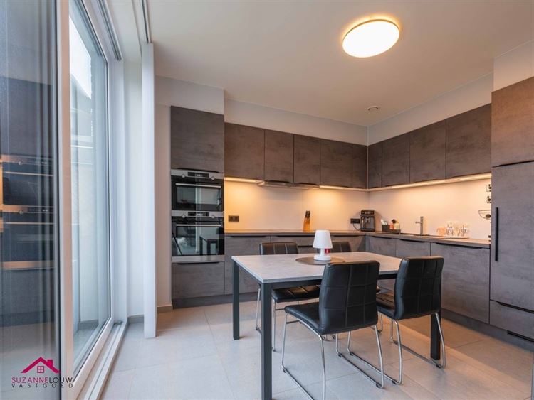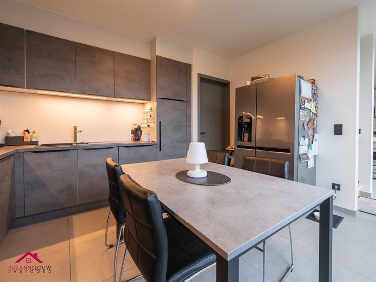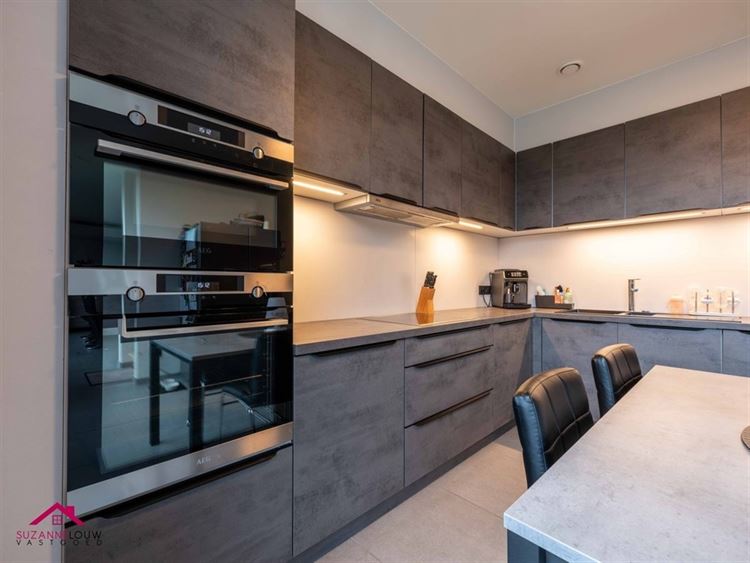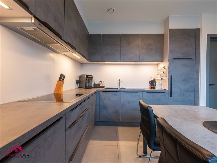 - Strak ingerichte keuken in verbinding met de leefruimte, voorzien van volgende toestellen: inductie kookplaat, afzuigkap, oven, combi-oven, vaatwasser, koelkast en een spoelbak met kraanwerk en afzetvlak. Voldoende bergruimte door onder- en bovenkasten. De trap naar de verdieping bevindt zich tussen de keuken en de leefruimte.