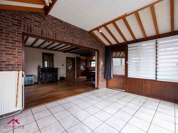 - Veranda met zicht over de achtertuin. Toegang tot het terras via het grote schuifraam. Keramische tegelvloer.