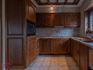 - Open keuken met melanine werkblad en voorzien van volgende toestellen: keramische kookplaat met afzuigkap, microgolfoven, koelkast en dubbele spoelbak met afzetvlak en kraanwerk. Wandtegels tussen onder- en bovenkasten. Keramische tegelvoer.