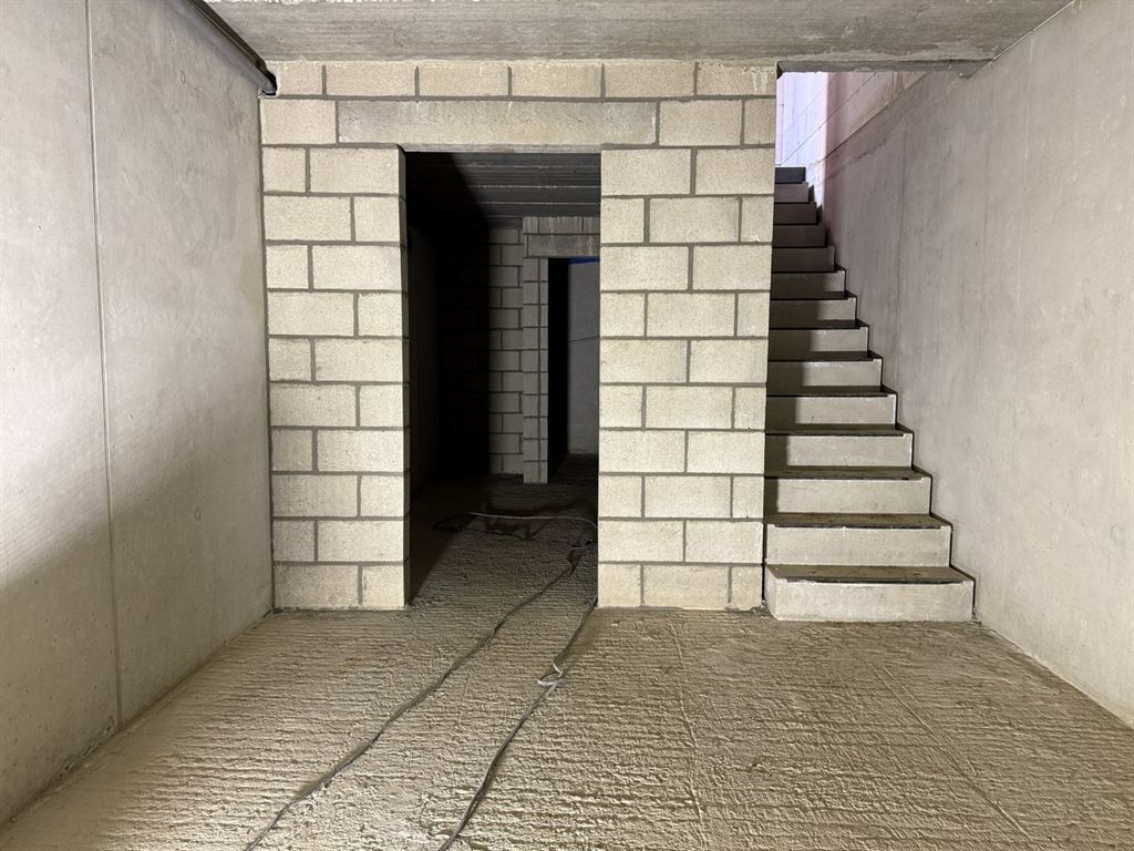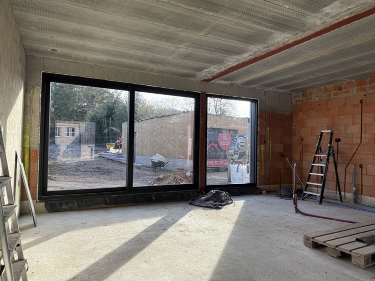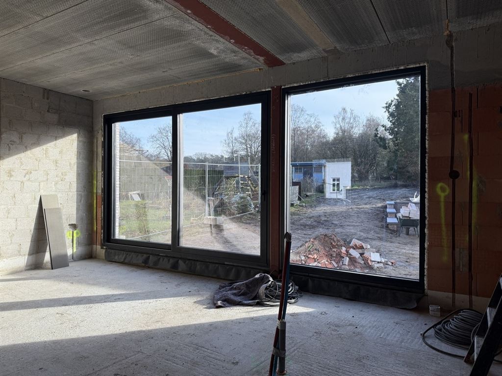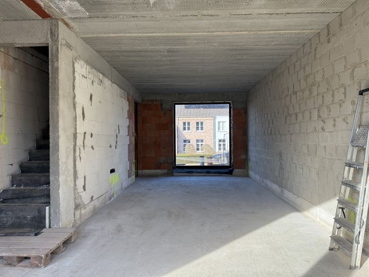 - Leefruimte met voldoende plaats voor het creëren van een zit- en eethoek en open keuken. Genietend van veel lichtinval. Toegang tot het terras. Trap naar de 1ste verdieping vanuit de open keuken.
