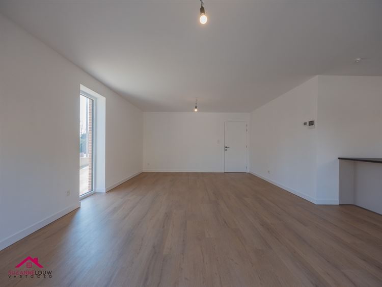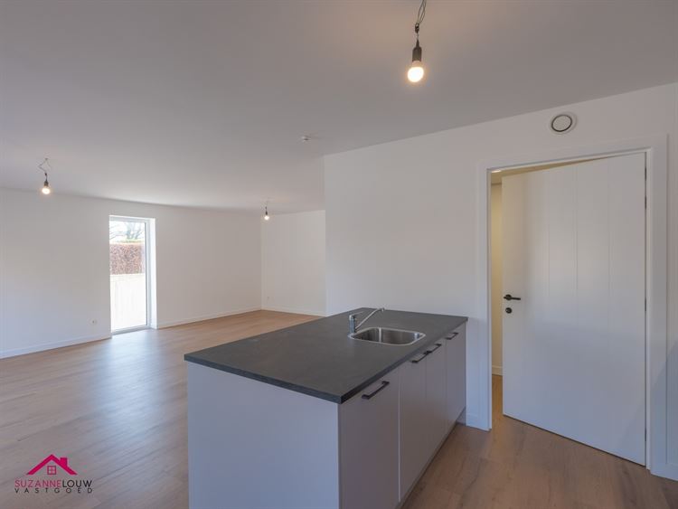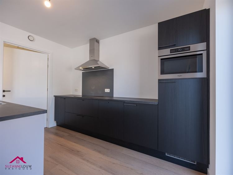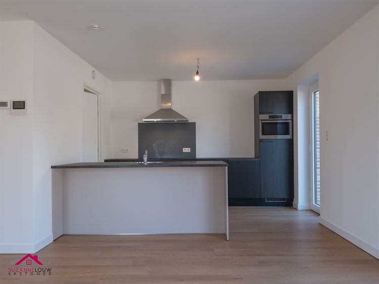 - Gezellige leefruimte met open keuken. Meer dan voldoende plaats voor het inrichten van een zit- en eethoek. Veel lichtinval dankzij de grote raampartijen. Toegang tot het terras via de grote schuifraam. Open keuken voorzien van melanine werkblad en uitgerust met volgende toestellen: keramische kookplaat, afzuigkap, inox spoelbak met kraanwerk, koelkast en energiezuinige vaatwasser. De keuken is volledig voorzien van soft-close laden en deuren. Toegang tot de achterliggende berging.