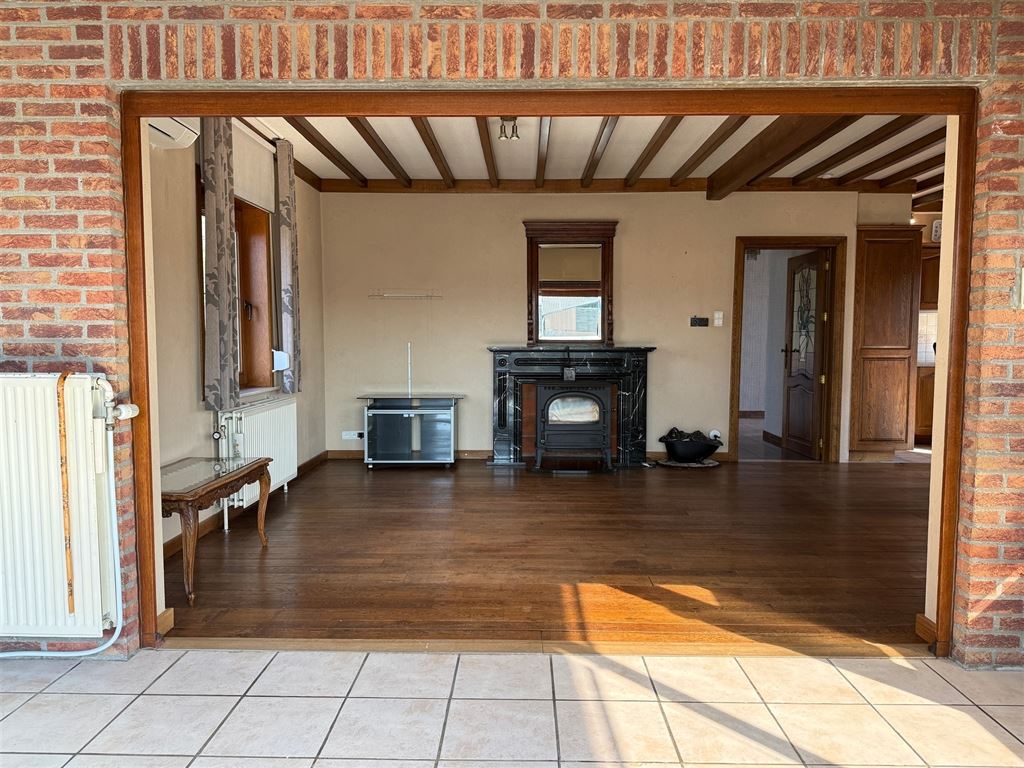 - Gezellige leefruimte met parketvloer. Voldoende plaats voor het inrichten van een zit- en eethoek. Voorzien van een houtkachel en airco. Directe toegang tot de open keuken en de veranda.