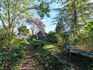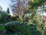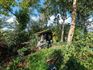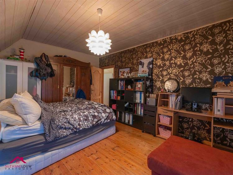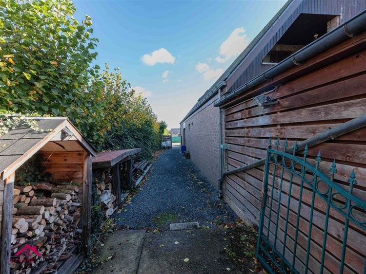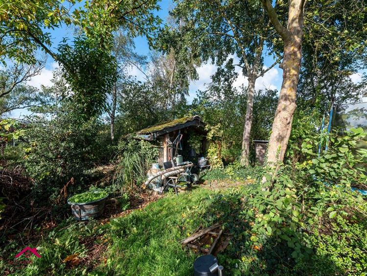 De achtertuin werd aangelegd met gazon, beplanting, struiken en bomen. Hier bevindt zich nog een tuinhuis. Aan het einde van het perceel vinden we nog een omheinde weide met stal terug, ideaal voor het houden van kleinvee.