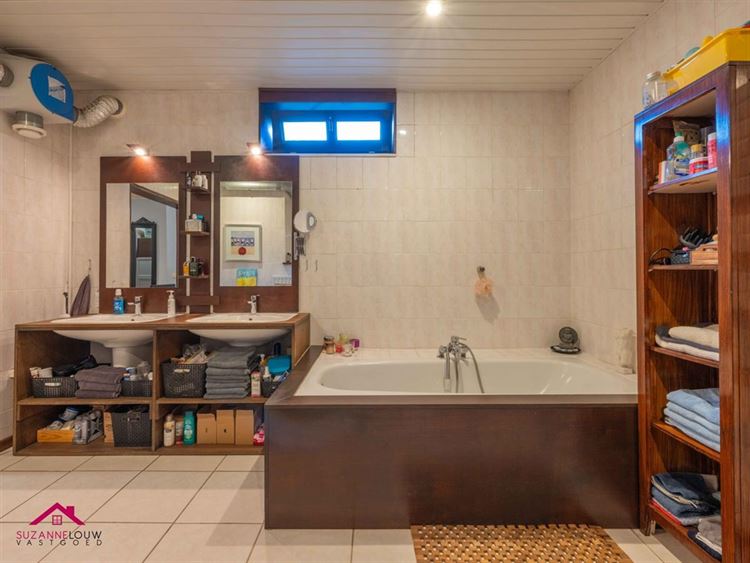 - Badkamer 1, uitgerust met een badkamermeubel met dubbele lavabo, spiegel met verlichting, toilet, ligbad, en douche. Wandtegels tot plafondhoogte. Keramische vloertegel.