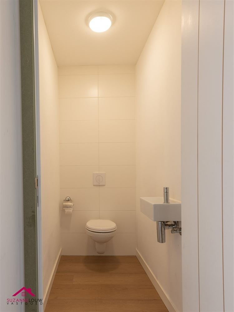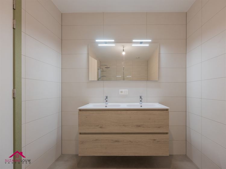 - Ingerichte badkamer, voorzien van badkamermeubel met soft-close laden met dubbele lavabo, spiegel met verlichting en inloopdouche. Wandtegels tot plafondhoogte. Keramische tegelvloer.