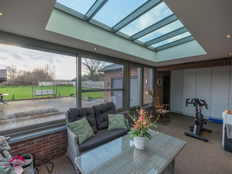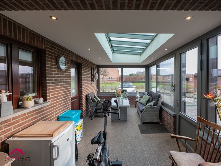- Veranda met zicht over de achtertuin. Voorzien van op maat gemaakte kastenwand. Toegang tot de inpandige garage. Steentapijt vloerbekleding.