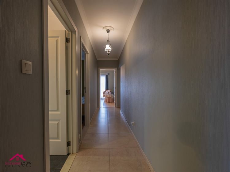 - Ruime inkomhal met toegang tot de diverse ruimtes. Beige keramische tegelvloer.