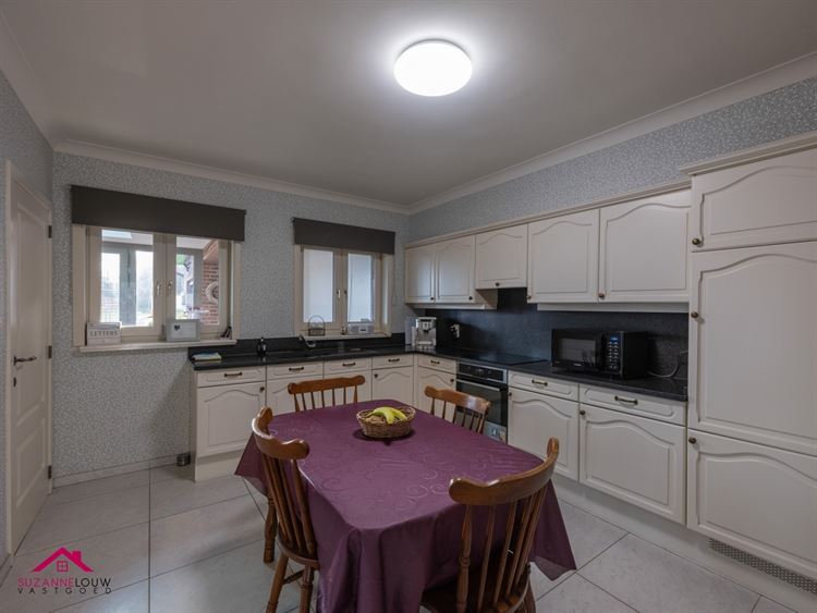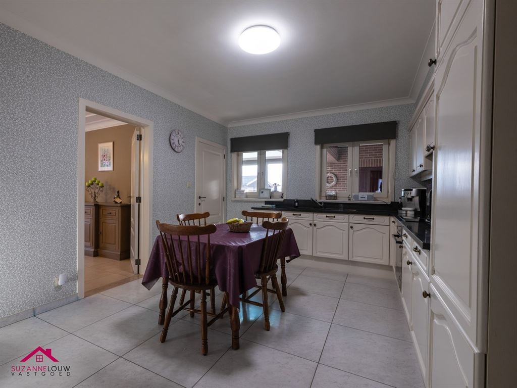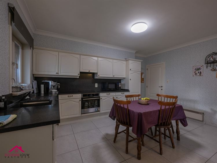 - Ingerichte keuken, met voldoende ruimte voor het plaatsen van een eettafel, uitgerust met een granieten werkblad en voorzien van volgende toestellen: keramische kookplaat met afzuigkap, oven, microgolfoven, koelkast en dubbele spoelbak met afzetvlak en kraanwerk. Toegang tot de achterinkom en de inkomhal. Witte keramische tegelvloer.