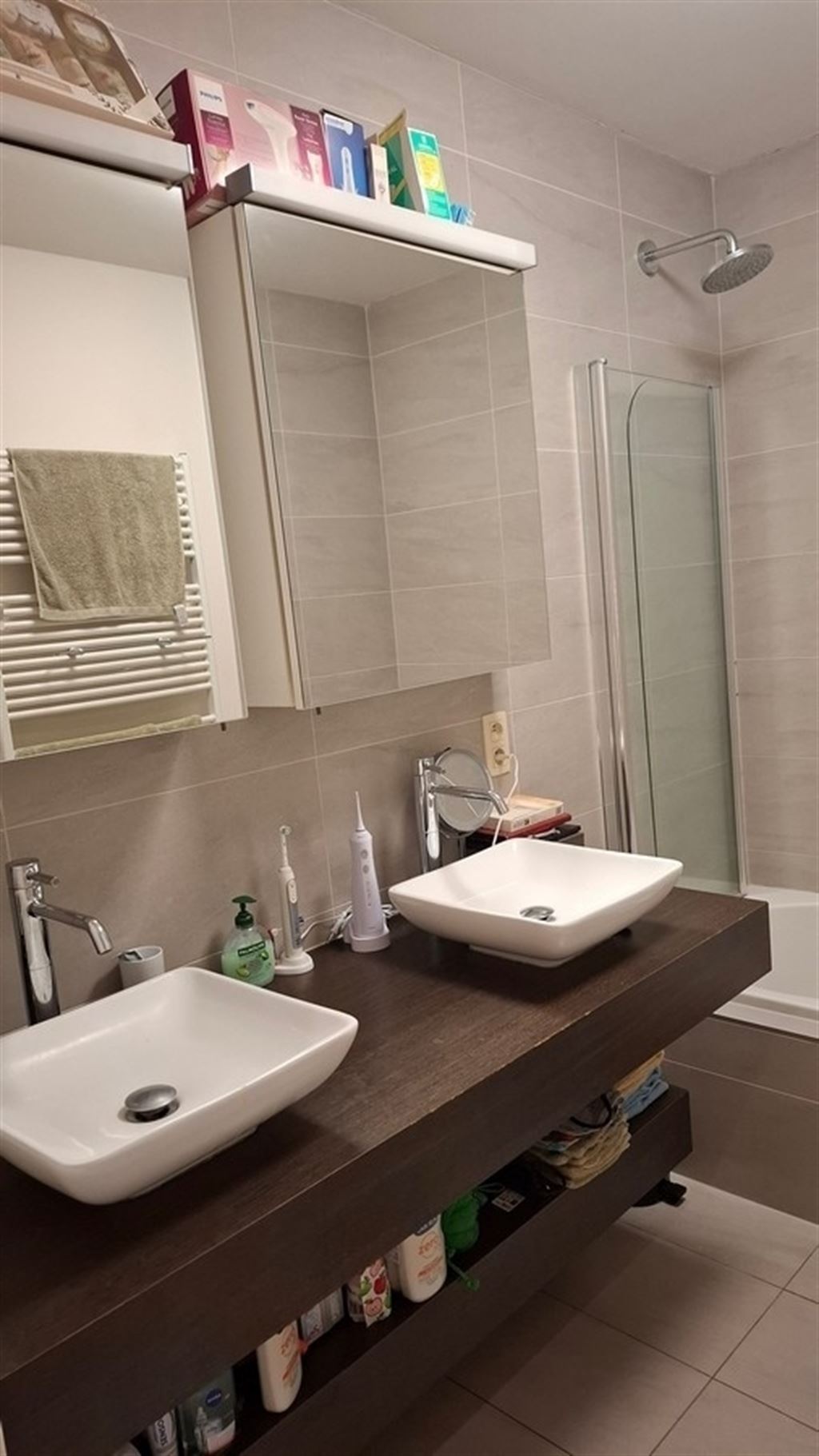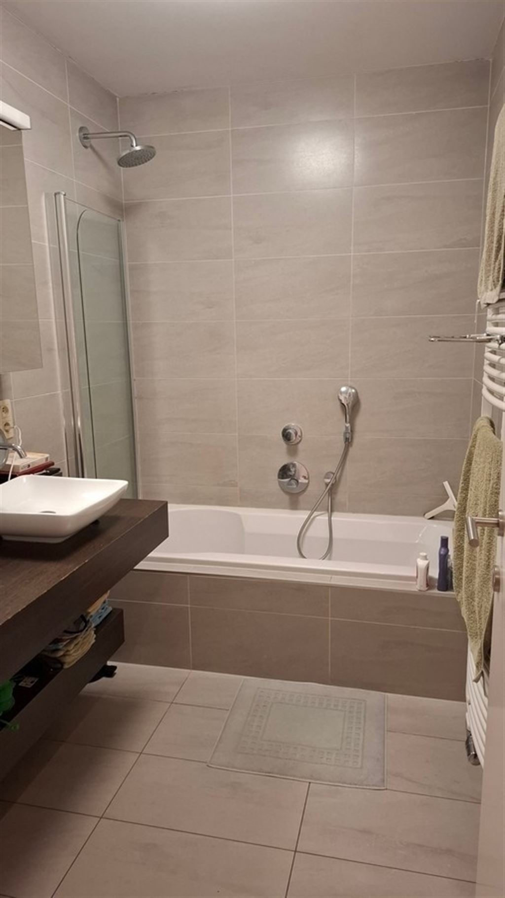 - Ingerichte badkamer voorzien van een douche-bad en een ruim badkamermeubel met dubbele lavabo.