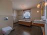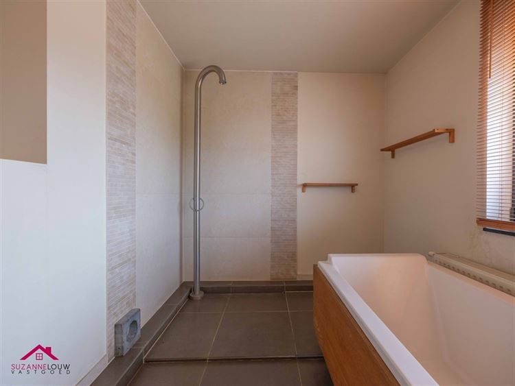 - Ingerichte badkamer voorzien van lavabo met spiegel, ligbad, inloopdouche en toilet. Wandtegels bij de natte zones en een keramische tegelvloer.
