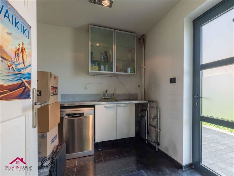 - Bijkeuken/berging/wasplaats. Hier bevindt zich de aansluiting voor de wasmachine. Toegang tot de oprit.