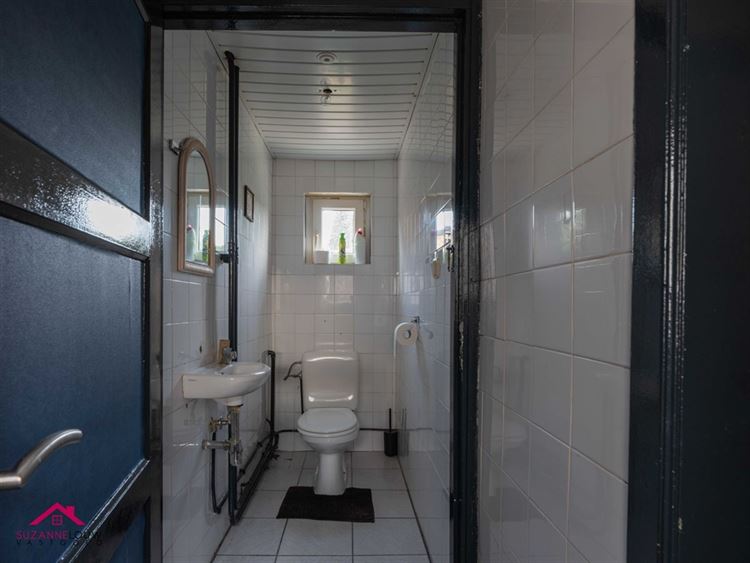- Gastentoilet met handwasbakje. Wandtegels tot plafondhoogte. Keramische tegelvloer.