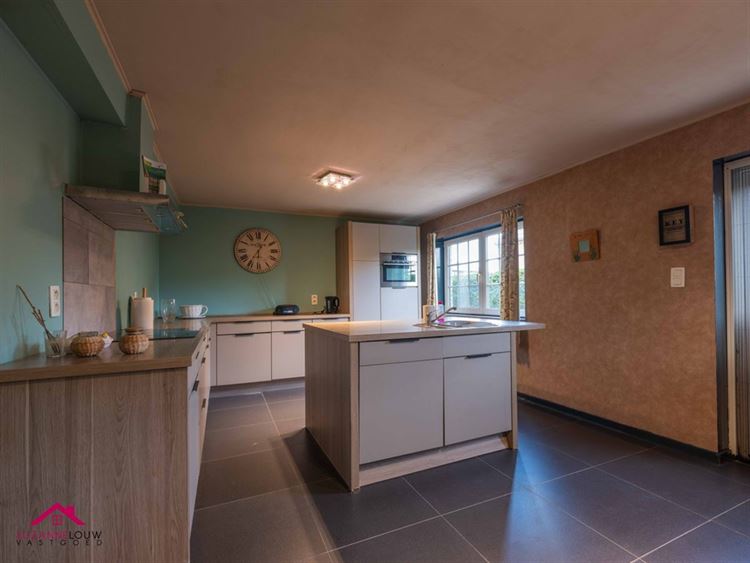 - Volledig ingerichte keuken met melamine werkblad en voorzien van volgende toestellen: keramische kookplaat, afzuigkap, combi-oven, koelkast, vaatwasser en spoelbak met kraanwerk. Voldoende opbergruimte en ruimte voor het plaatsen van een eettafel. Toegang tot het gastentoilet en de inpandige garage. Keramische tegelvloer.
