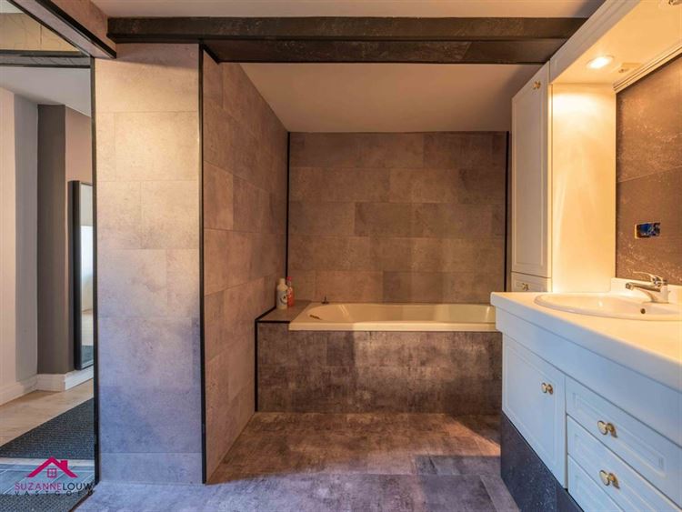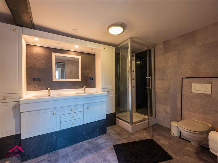 - Ingerichte badkamer voorzien van badkamermeubel met dubbele lavabo, kolomkasten en spiegel met verlichting, douchecabine, ligbad en toilet. Wandtegels tot plafondhoogte. Keramische tegelvloer.