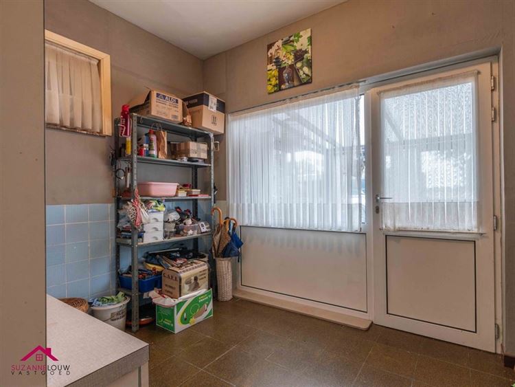 - Berging/wasplaats. Hier bevindt zich de aansluiting voor de wasmachine. Wandtegels tot bepaalde hoogte. Keramische tegelvloer. Toegang tot de veranda.