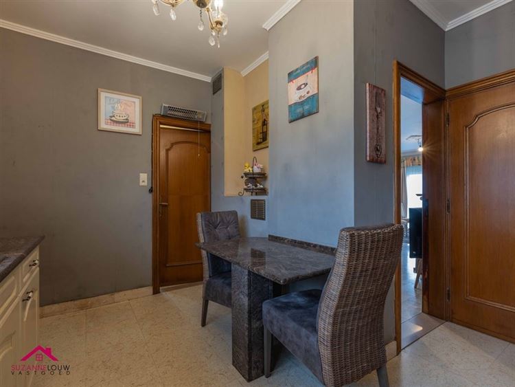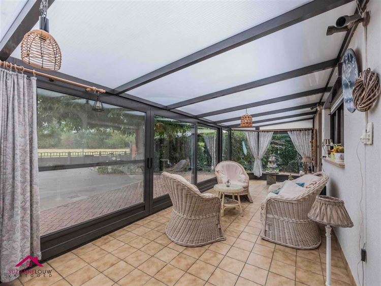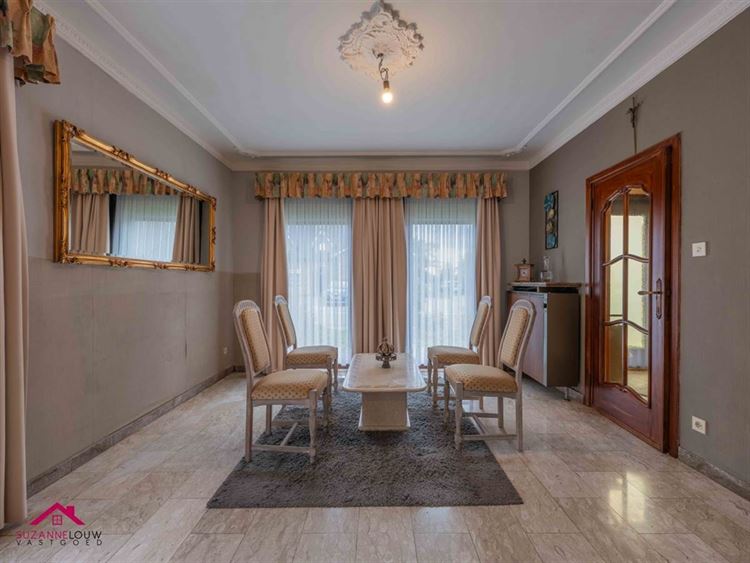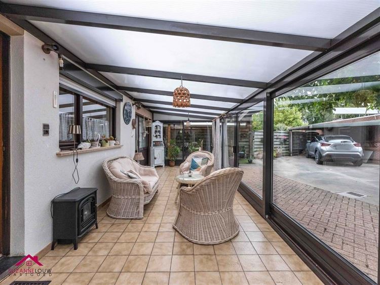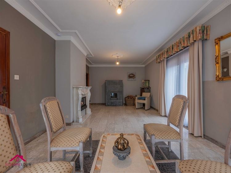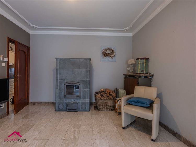 - Gezellige leefruimte met voldoende plaats voor het inrichten van een zit- en eethoek, uitgerust met een Flam inbouwhaard en een speksteenkachel op hout. De leefruimte heeft contact met zowel de straat- als de tuinzijde, wat zorgt voor veel lichtinval. Vanuit de leefruimte heeft men toegang tot de keuken. Travertin vloer.