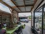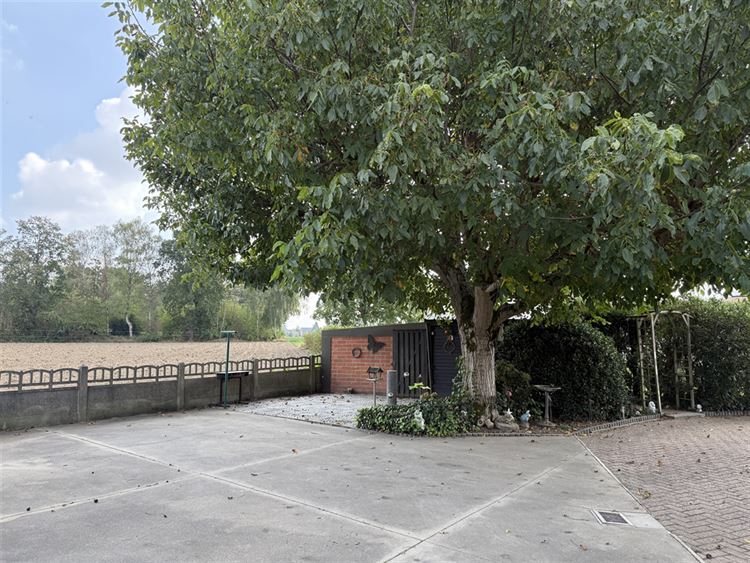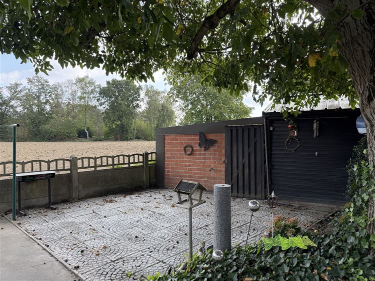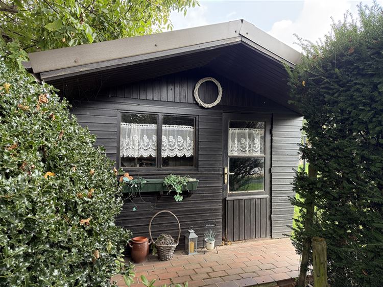 De achtertuin werd zeer onderhoudsvriendelijk aangelegd. Hier vinden we de vrijstaande garage, alsook 2 carporten terug. Tevens bevindt zich in de achtertuin nog een tuinhuis.