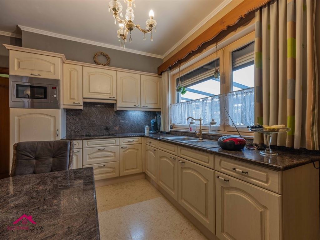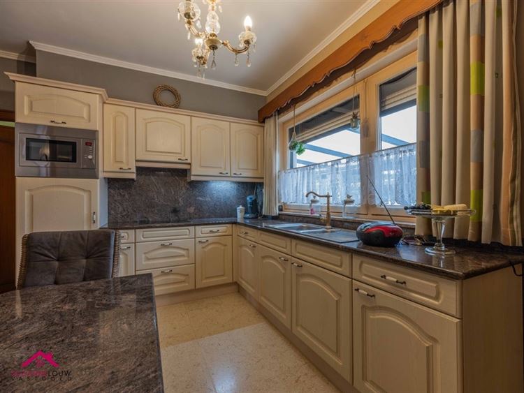 - Ingerichte keuken met granieten werkblad en voorzien van volgende toestellen: inductie kookplaat, afzuigkap, combi-oven en inox spoelbak met afzetvlak en kraanwerk. Het werkblad werd doorgetrokken tussen onder- en bovenkasten. Keramische tegelvloer. Toegang tot de berging en de badkamer.