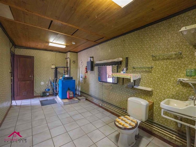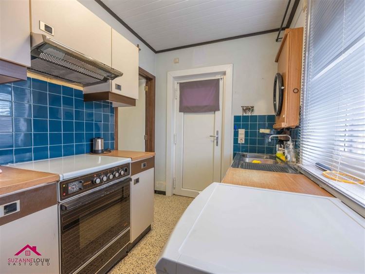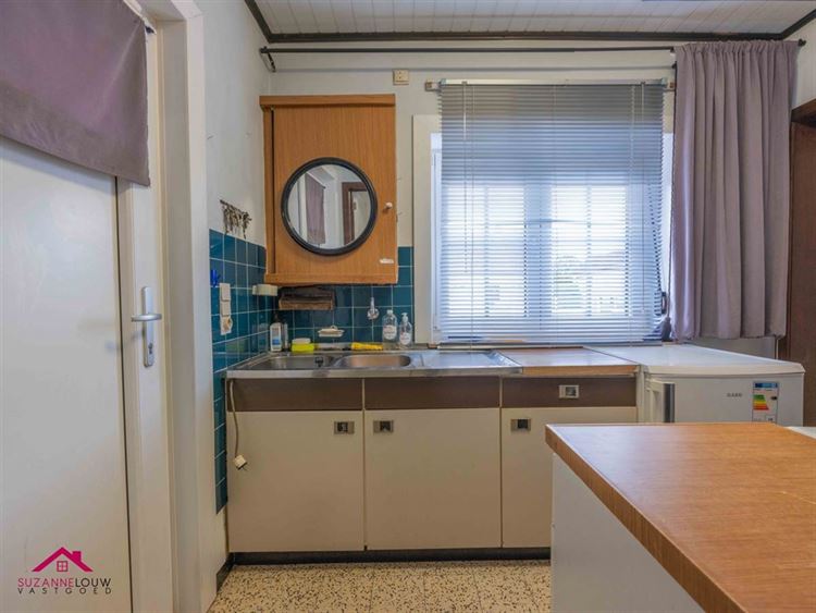 - Ingerichte keuken voorzien van volgende toestellen: fornuis met afzuigkap en inox spoelbak met afzetvlak en kraanwerk. Toegang tot de tuin. Stenen tegelvloer. Wandtegels tussen onder- en bovenkasten.