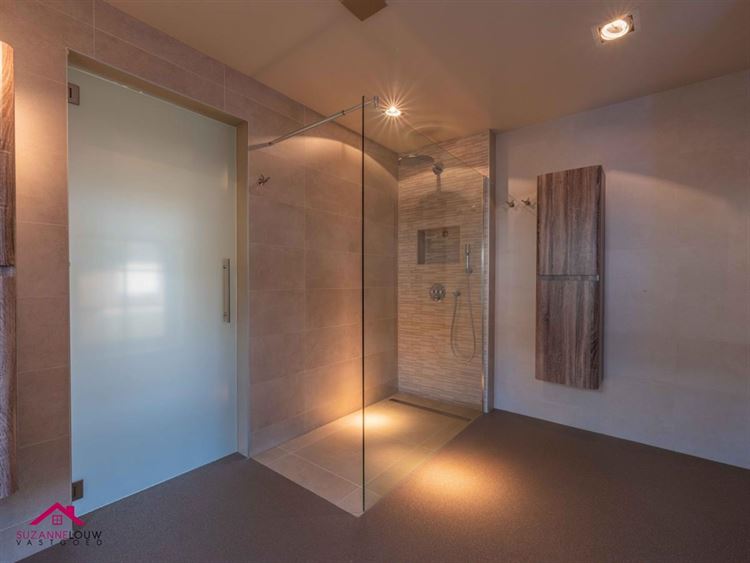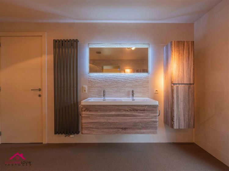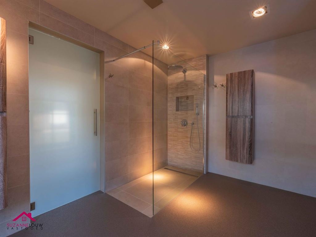 - Ingerichte badkamer, voorzien van badkamermeubel met dubbele lavabo, spiegel met verlichting, kolomkasten, inloopdouche en sierradiator. Wandtegels tot plafondhoogte.