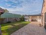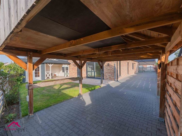 Ook de achtertuin werd onderhoudsvriendelijk aangelegd met gazon. Hier bevindt zich tevens nog een tuinhuis met overdekt terras. Het terras grenzend aan de achterzijde van de woning werd beklinkerd en is voorzien van een windscherm. De voorzieningen voor het plaatsen van een zonneluifel zijn reeds aanwezig.
