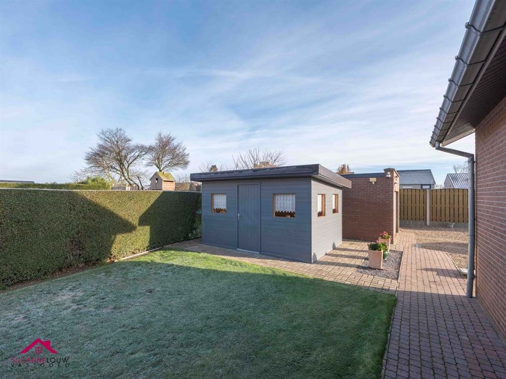 Ook de achter- en linkerzijde van de tuin werd onderhoudsvriendelijk en zeer netjes aangelegd met gazon. Hier bevindt zich nog een tuinhuis, voorzien van een keramische tegelvloer.