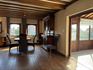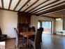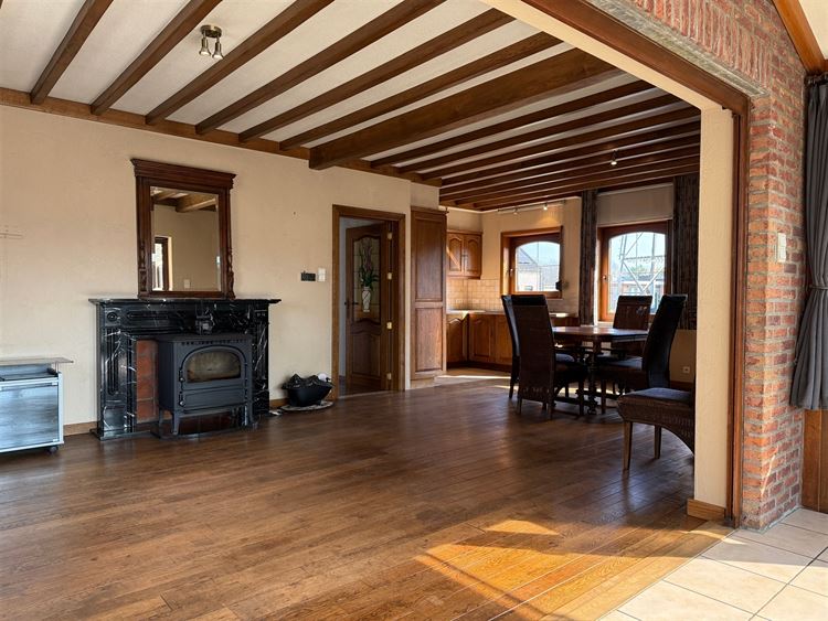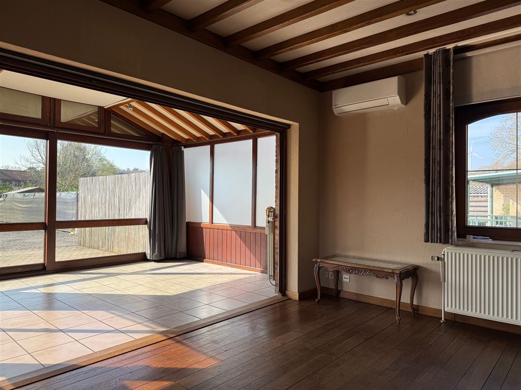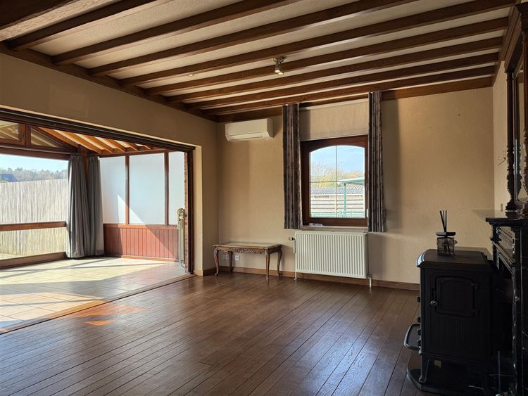 - Gezellige leefruimte met parketvloer. Voldoende plaats voor het inrichten van een zit- en eethoek. Voorzien van een houtkachel en airco. Directe toegang tot de open keuken en de veranda.