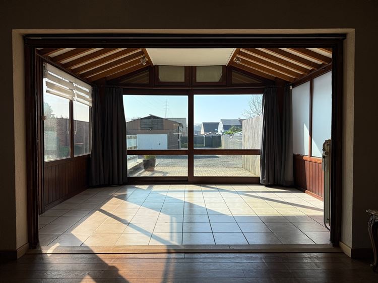 - Veranda met zicht over de achtertuin. Toegang tot het terras via het grote schuifraam. Keramische tegelvloer.