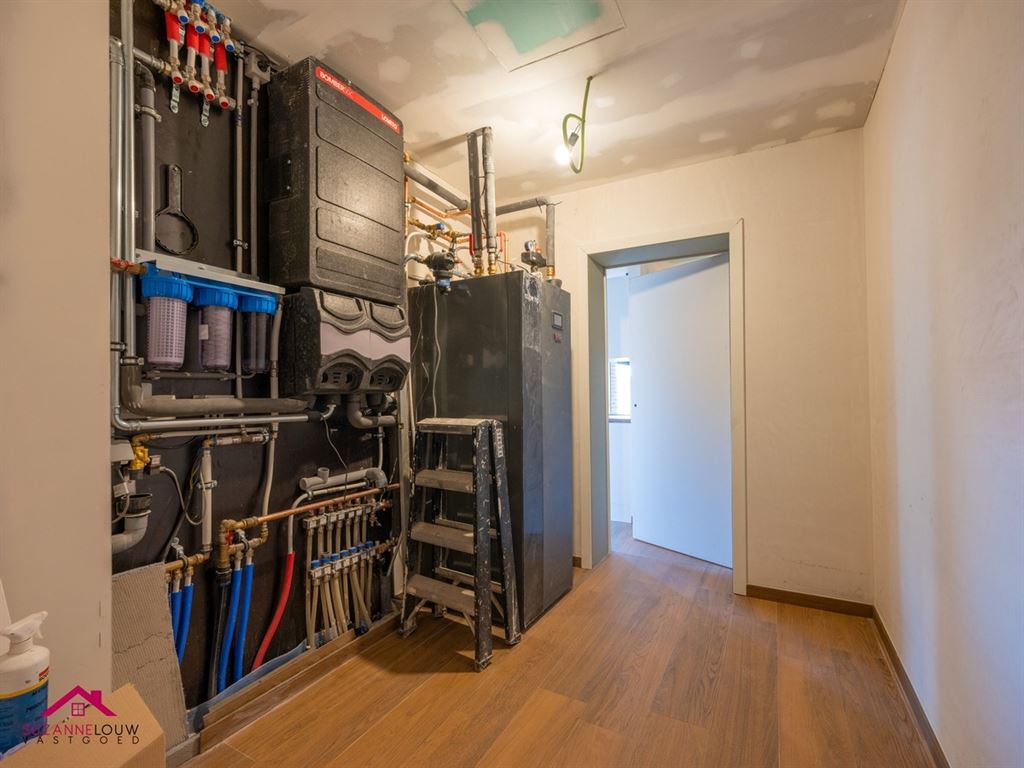 - Verwarmingsinstallatie en warm water via warmtepomp. Vloerverwarming en ventiloconvectoren op de verdieping die zowel koelen als verwarmen.