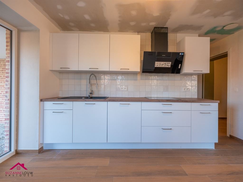 - Ingerichte keuken, voorzien van alle comfort en uitgerust met volgende toestellen: keramische kookplaat, afzuigkap, combi-oven, vaatwasser, koelkast en diepvriezer. Wandtegels tussen onder- en bovenkasten. Toegang tot de tuin.