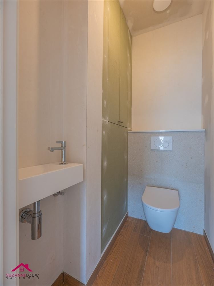- Gastentoilet met handwasbakje. Voorzien van op maat gemaakte wandkast waarin zich de elektriciteitskast bevindt.