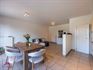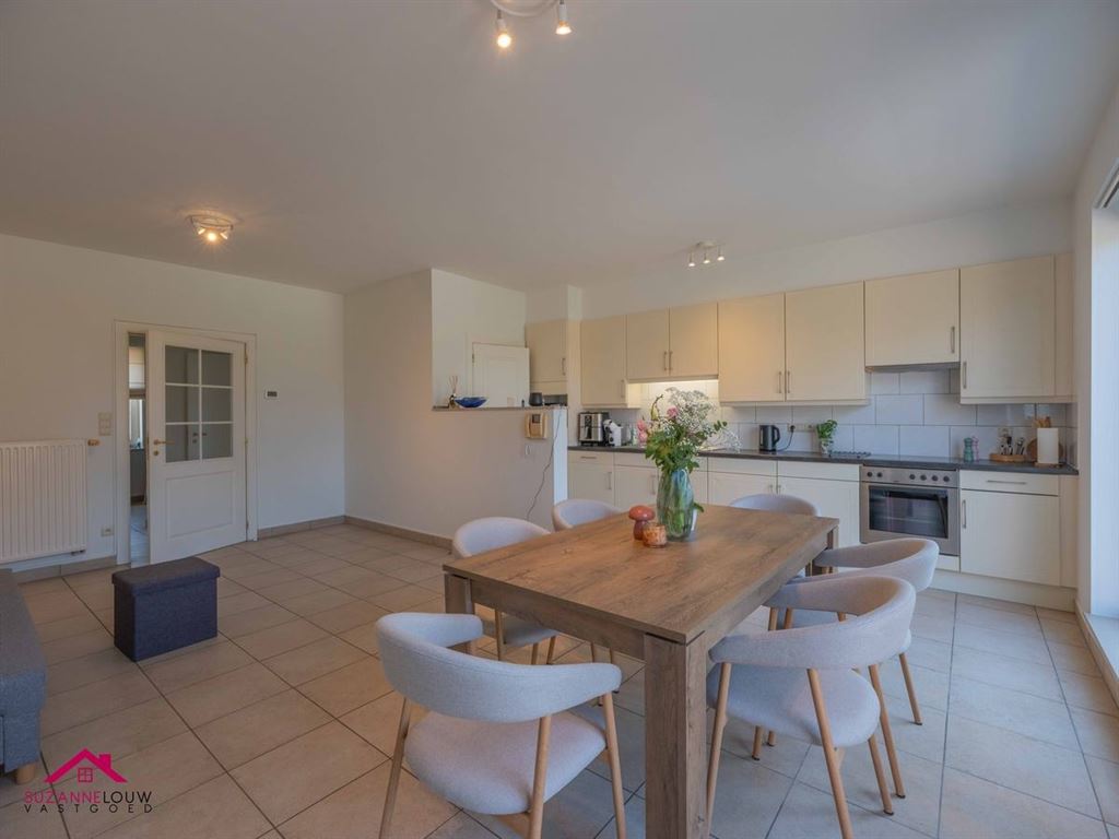 - Gezellige leefruimte met open keuken. Voldoende plaats voor het inrichten van een zit- en eethoek. Veel lichtinval dankzij de grote raampartijen die uitgeven op het terras. De keuken is uitgerust met volgende toestellen: inductie kookplaat met afzuigkap, oven, koelkast, en inox spoelbak met afzetvlak en kraanwerk. Wandtegels tussen onder en bovenkasten. Toegang tot de achterliggende berging/wasplaats.