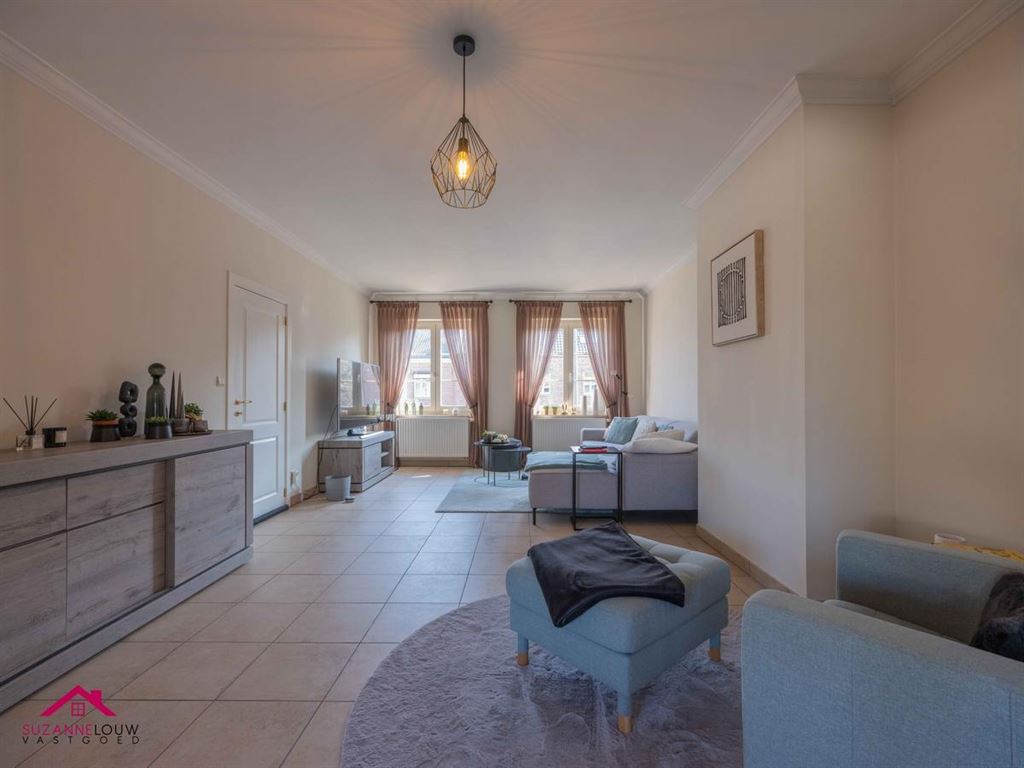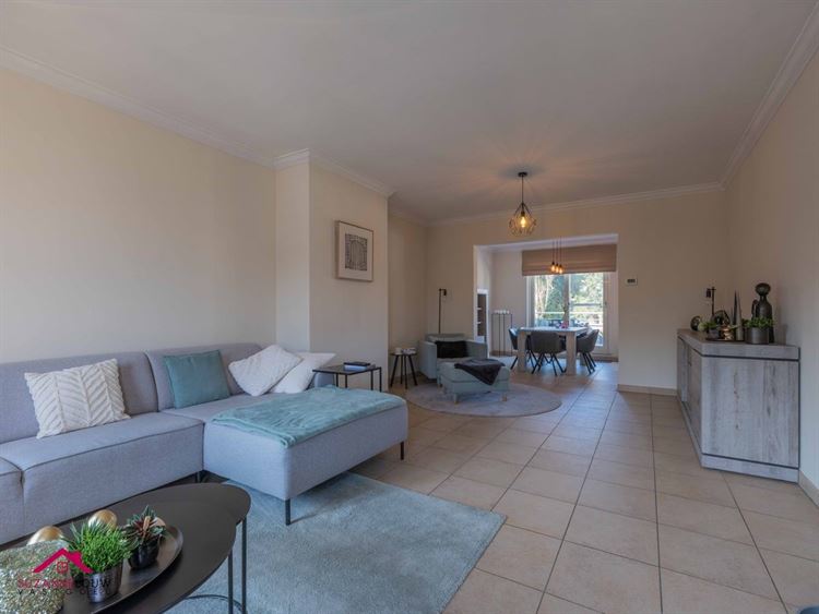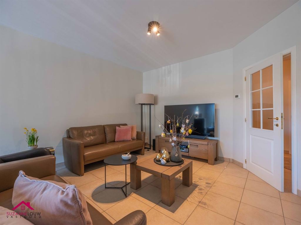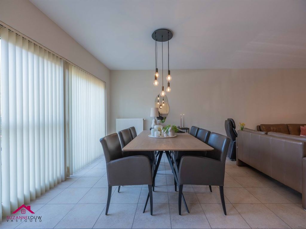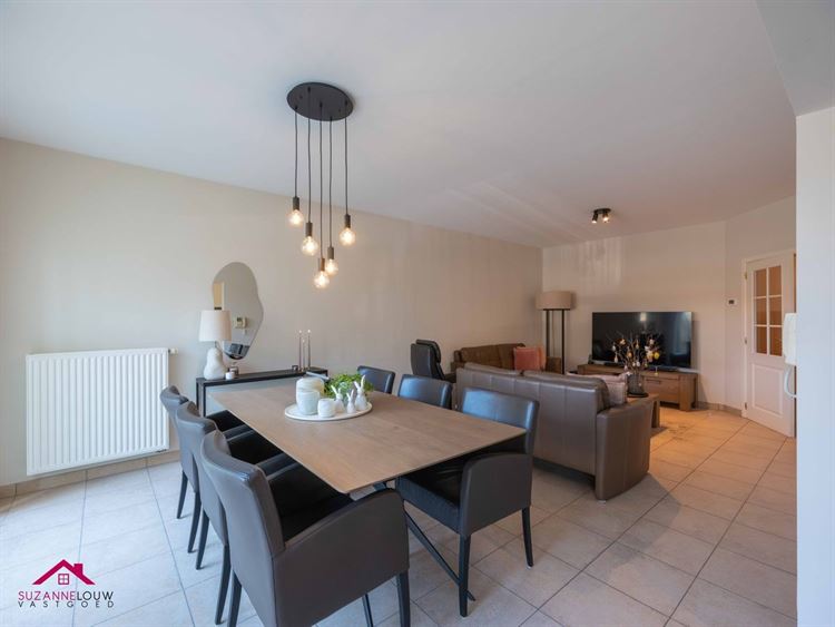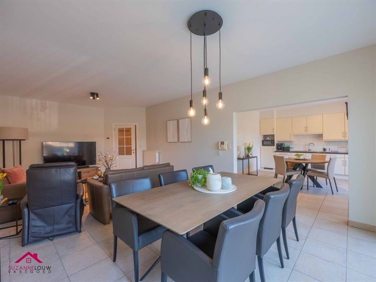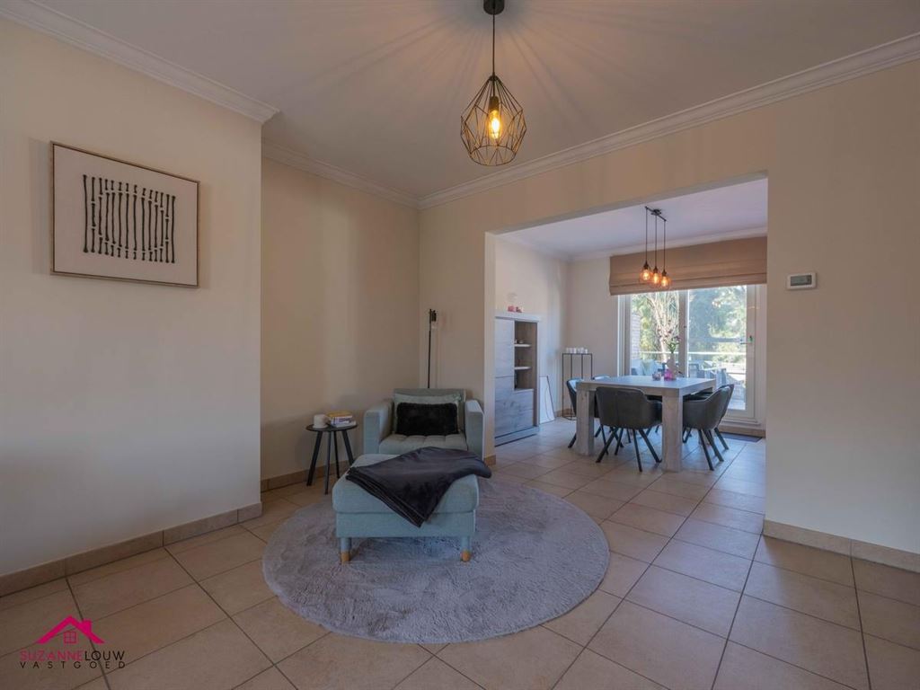 - Gezellige leefruimte met voldoende plaats voor het inrichten van een zit- en eethoek. Veel lichtinval dankzij de grote raampartij aan de achterzijde, dewelke uitgeeft op het terras. Directe toegang tot de keuken.