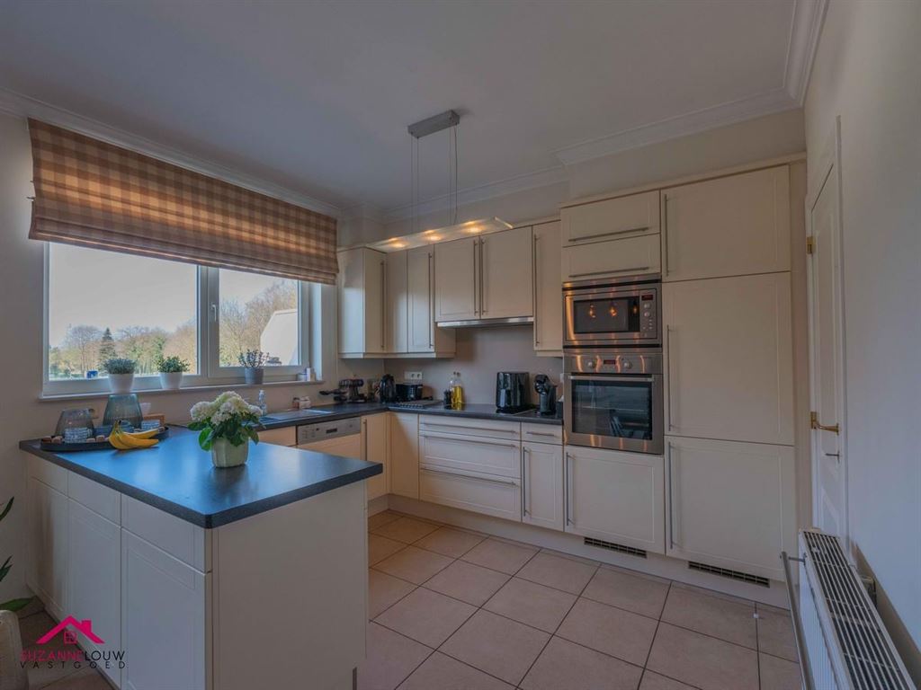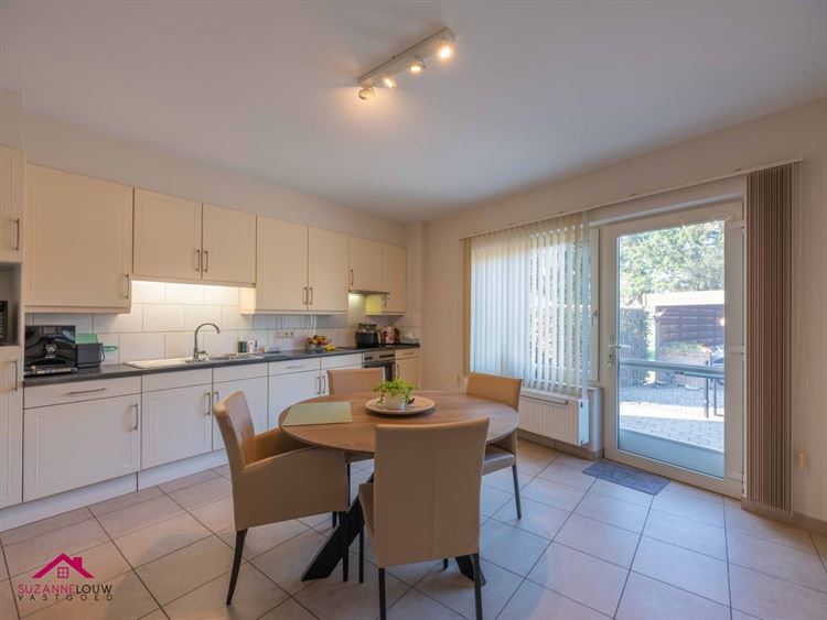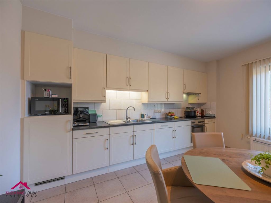 - Praktisch ingerichte keuken met voldoende ruimte voor het plaatsen van een eettafel en uitgerust met volgende toestellen: inductie kookplaat met afzuigkap, oven, koelkast, inox spoelbak met afzetvlak en kraanwerk en kunststof werkblad. Directe toegang tot het terras en de achterliggende berging/wasplaats.