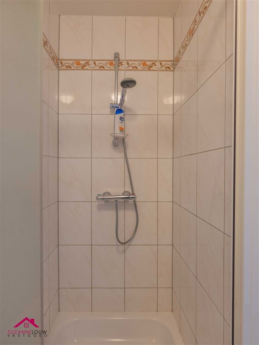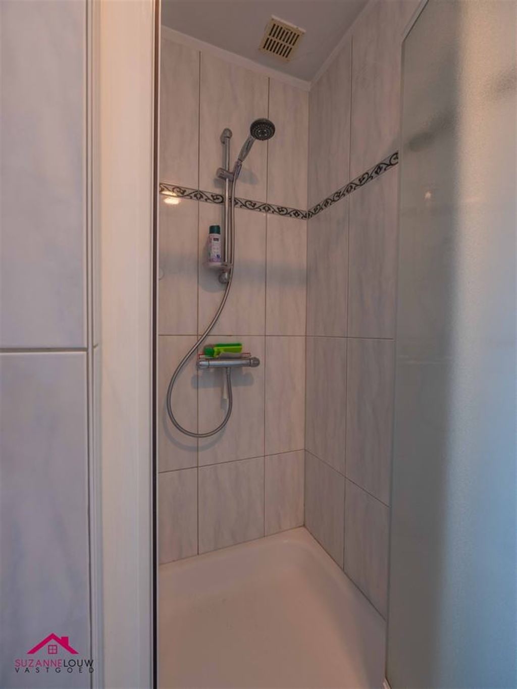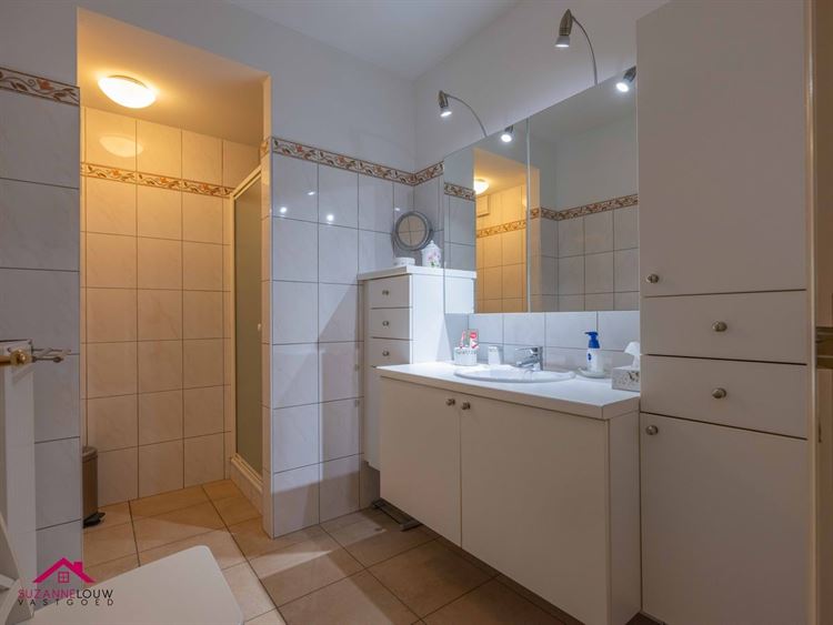 - Ingerichte badkamer, voorzien van badkamermeubel met lavabo, spiegelkast met verlichting, kolomkast en inloopdouche. Wandtegels tot bepaalde hoogte.