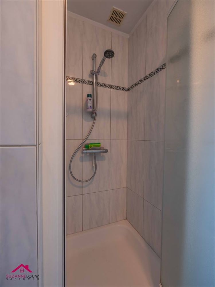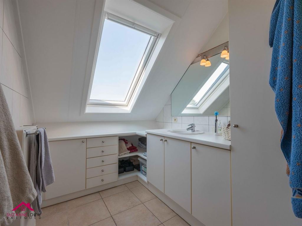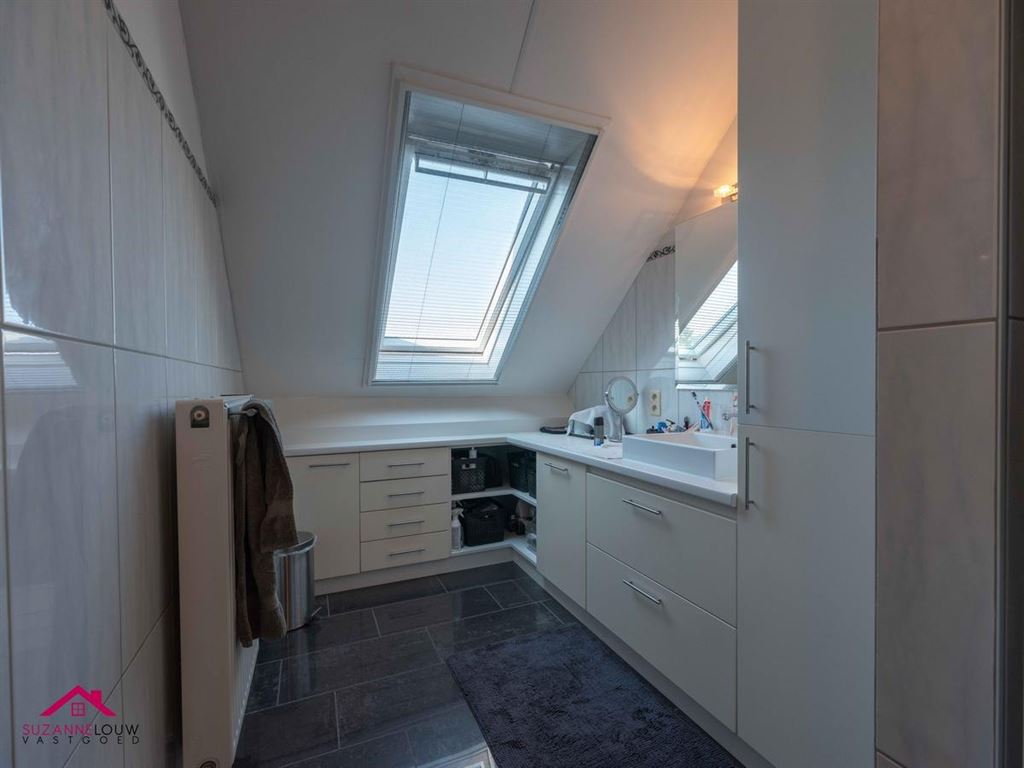 - Ingerichte badkamer, voorzien van badkamermeubel met lavabo en spiegel met verlichting en inloopdouche. Wandtegels tot bepaalde hoogte. Hier bevindt zich tevens de verwarmingsinstallatie. Veluxraam met rolluik.