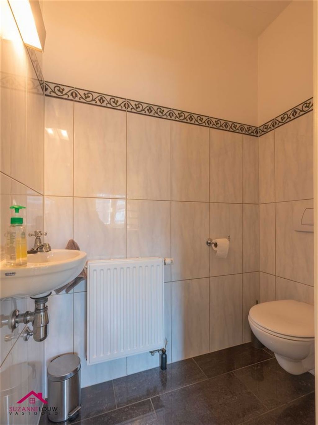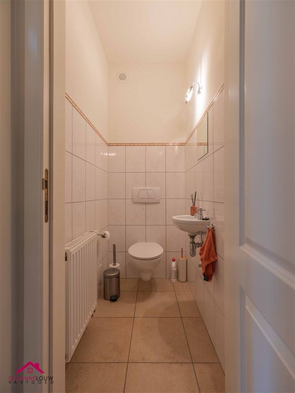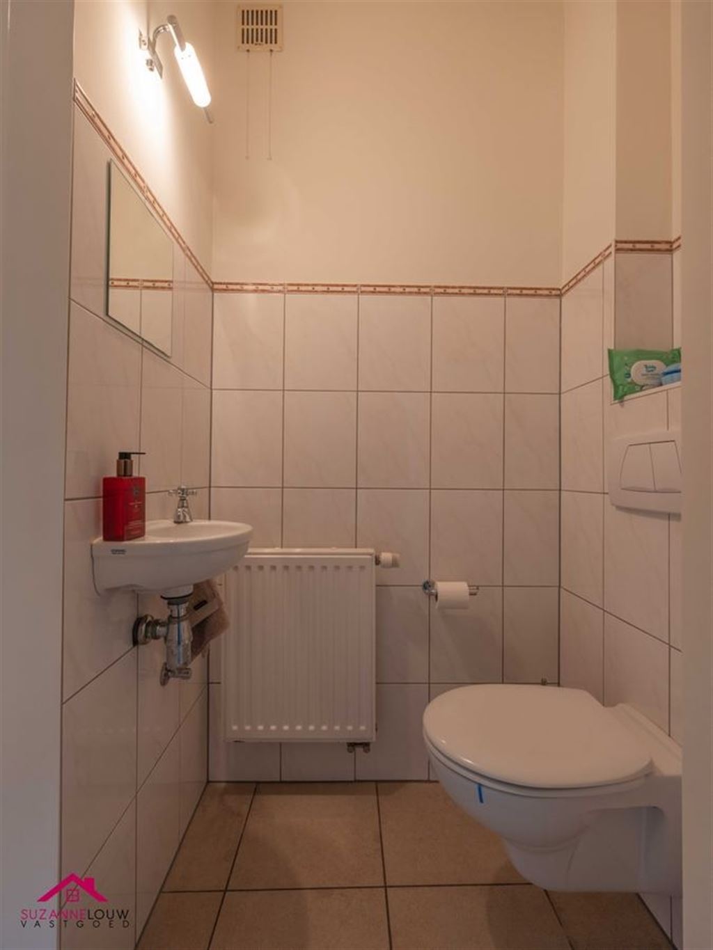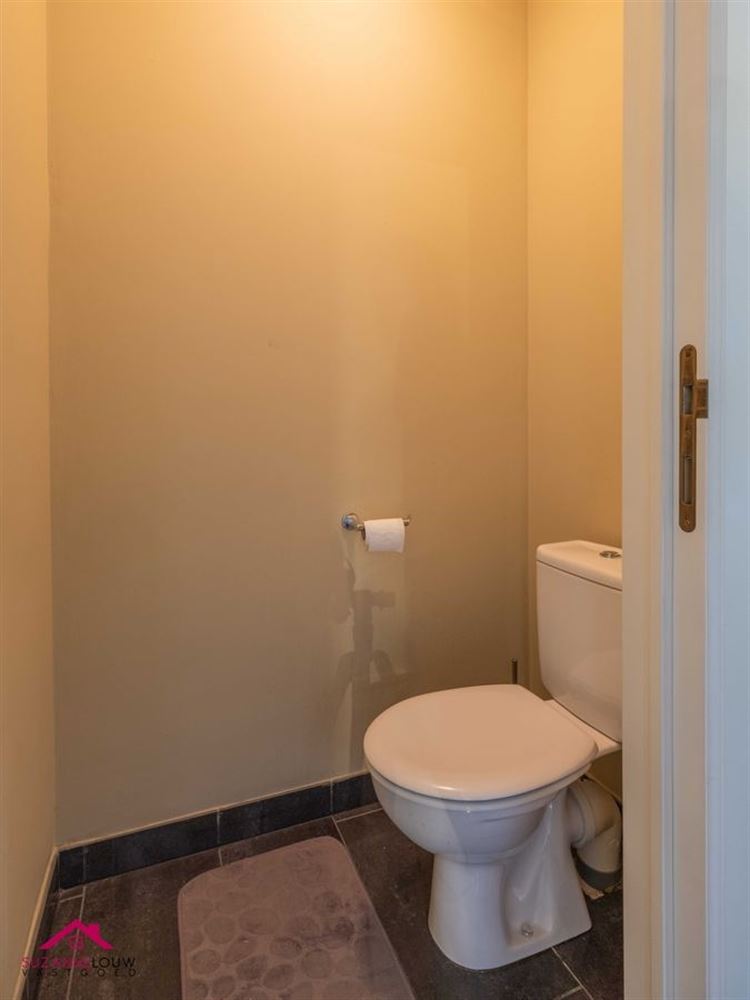 - Gastentoilet met handwasbakje. Wandtegels tot bepaalde hoogte. Verwarming.