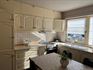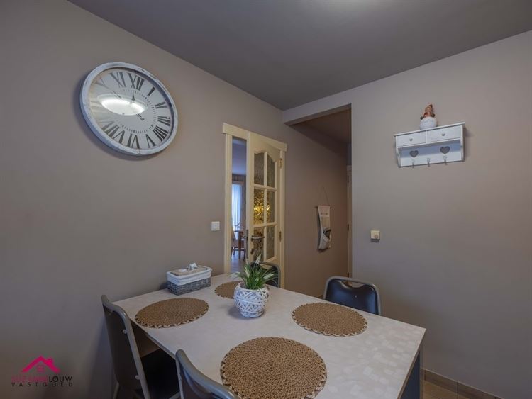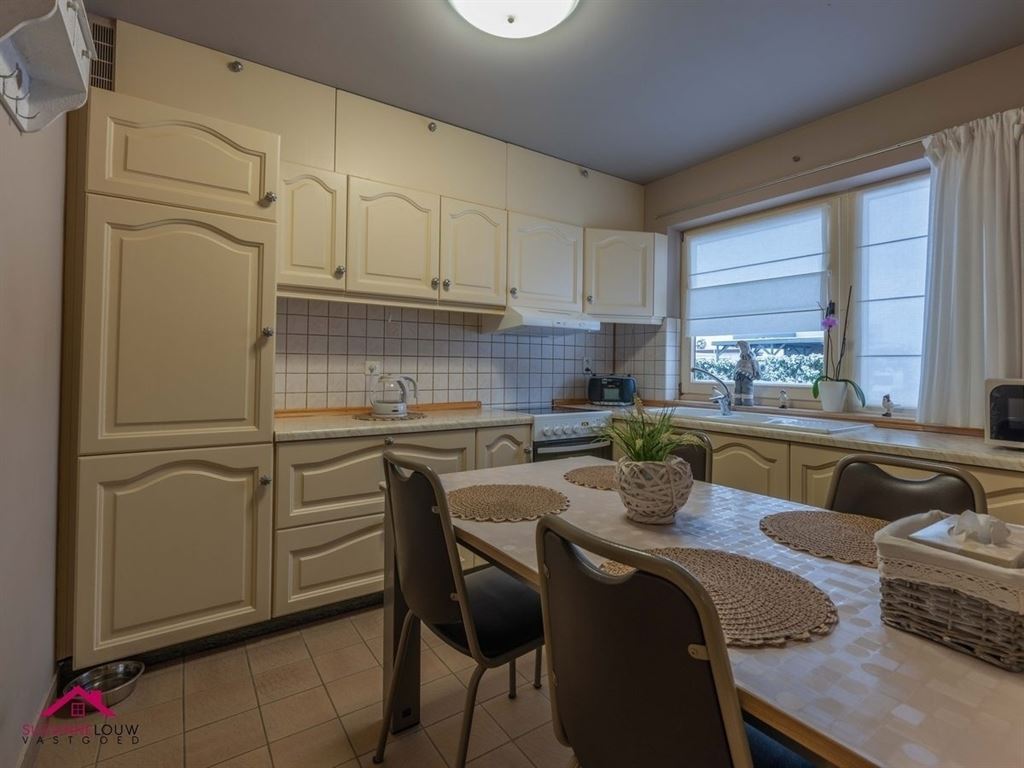 - Landelijk geïnstalleerde keuken met kunststof werkblad en voorzien van volgende toestellen: fornuis met keramische kookplaat en oven, afzuigkap, koelkast en dubbele spoelbak met afzetvlak en kraanwerk. Wandtegels tussen onder- en bovenkasten. Voldoende ruimte voor het plaatsen van een eettafel.