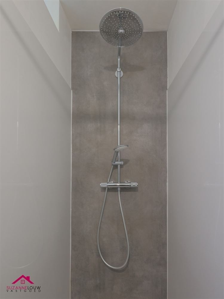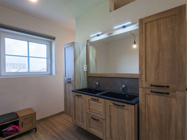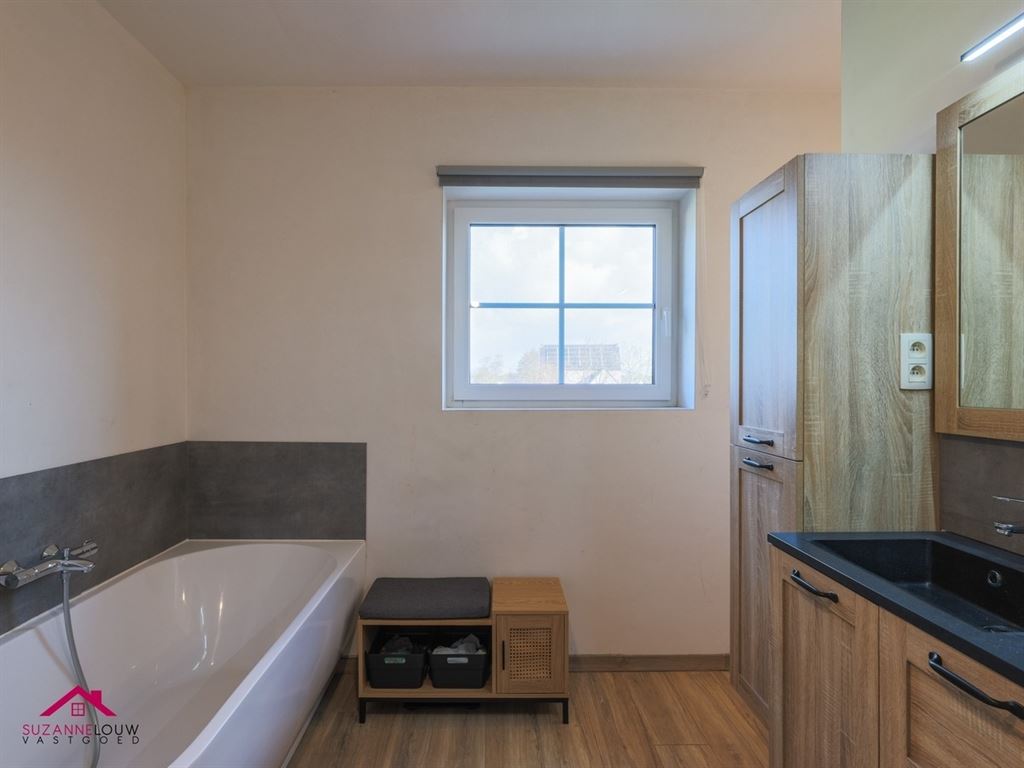- Ingerichte badkamer voorzien van een badkamermeubel met dubbele lavabo, wandspiegel, kolomkasten, ligbad, inloopdouche en toilet. Deels voorzien van wandtegels. Hier bevindt zich tevens de aansluiting voor de wasmachine. Keramische tegelvloer met parketlook.