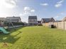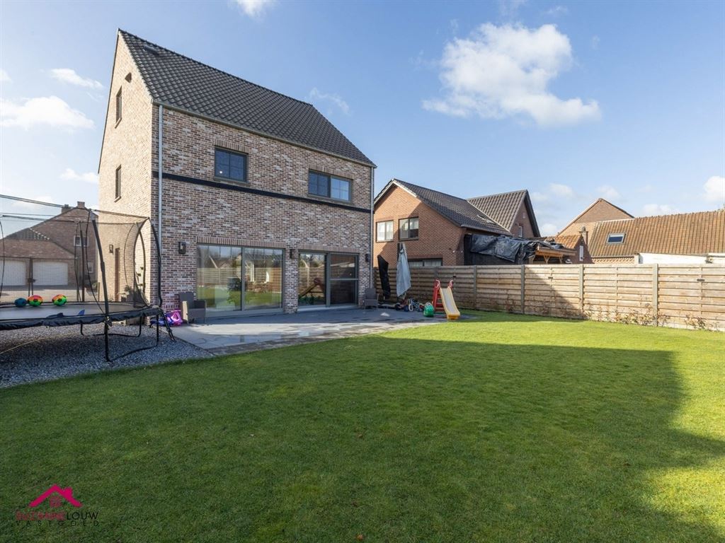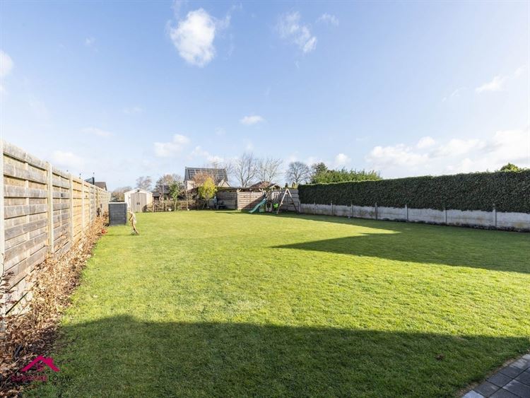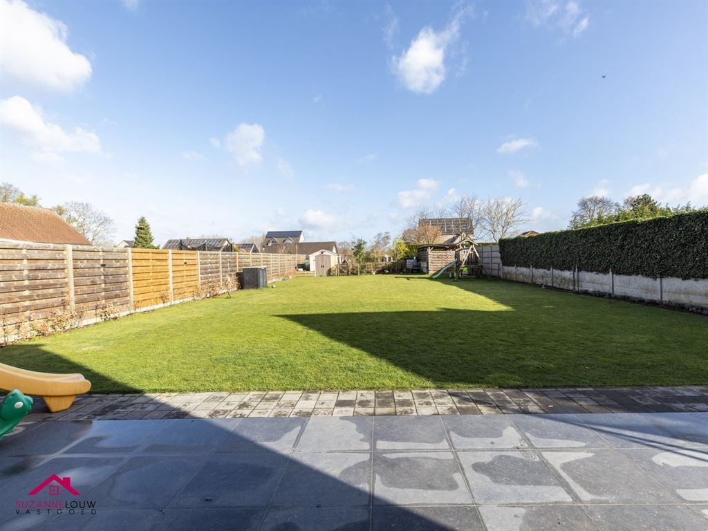 De achtertuin van de woning werd zeer onderhoudsvriendelijk aangelegd met gazon en een ruim terras.