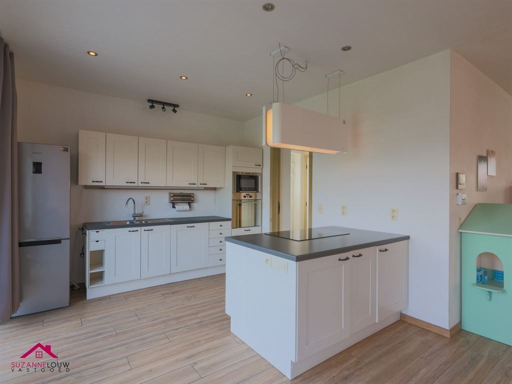 - Landelijk ingerichte keuken in verbinding met de leefruimte. Praktisch werkeiland met voldoende kastruimte. Uitgerust met een melanine werkblad en volgende toestellen: inductie kookplaat, afzuigkap, combi-oven, oven, vaatwasser en een inox spoelbak met afzetvlak en kraanwerk. Voldoende bergruimte door onder- en bovenkasten. Vanuit de keuken heeft men toegang tot de berging/wasplaats en de tuin.